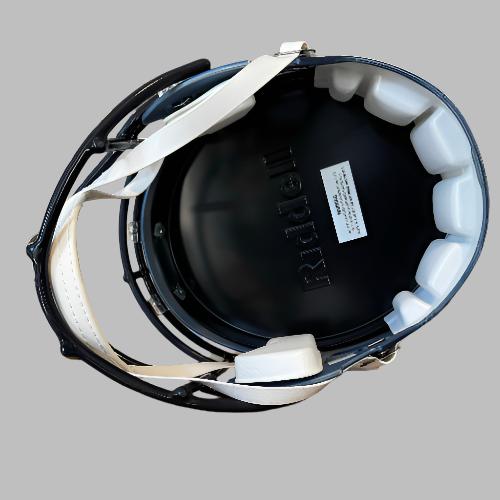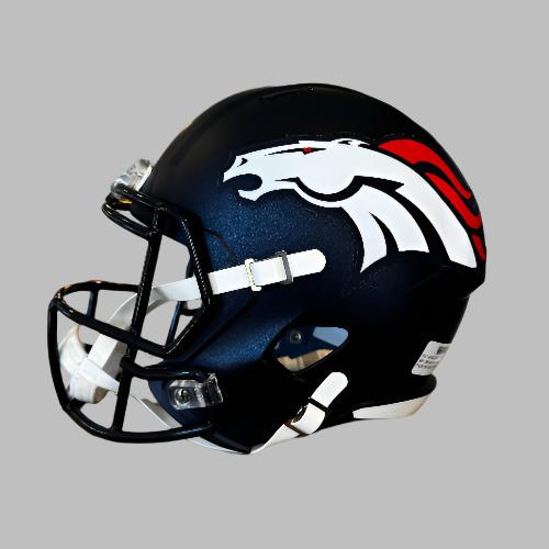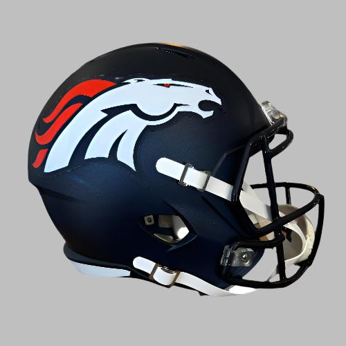 Denver Broncos Full Size Speed Replica NFL Helmet by Riddell. This full size Broncos helmet is designed with a non-wear plate and molded foam jaw pads. a steel polyvinyl-coated face mask, 4-pt chin strap, and elliptical air vents. NFL Team name on back bumper (except Chiefs, Steelers and Giants). The officially licensed NFL helmet is great for autographs and features Broncos team logo decals on both sides. The striking shape of the future. NFL Broncos Replica Speed helmet size medium measures: 12.75"(L), 9.25"(W), 9.75"(H). NFL Denver Broncos Full Size Speed Replica Helmet. (NOT FOR WEARING)